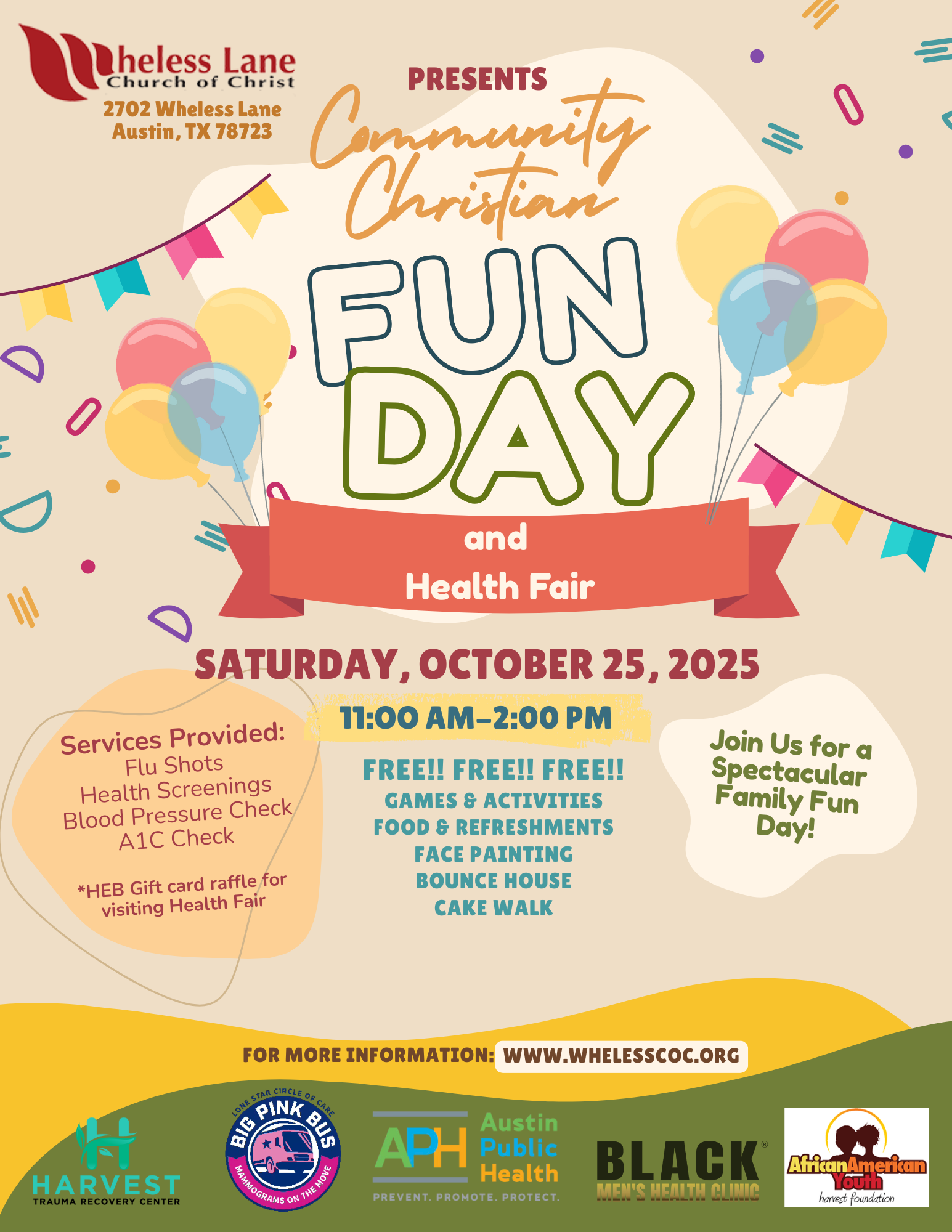 Austin Public Health and the Black Men’s Health Clinic are scheduled to participate in our health fair conducting blood pressure checks, Diabetes checks, HIV, flu shots/Covid-19 vaccines, Nutrition and healthy eating tips, and other pertinent activities that would address high co-morbidity risk factors. Please spread the word to those who can use these valuable services and support public health.