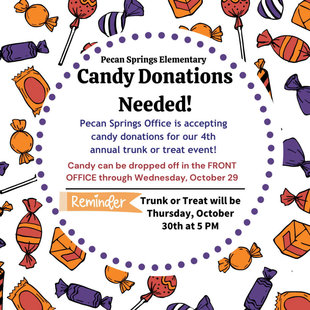 Pecan Springs Elementary School is hosting a Trunk ‘n’ Treat Thursday Oct 30th and need your help. They are asking for candy donations for the event. Donations can be dropped off at the front office through Wednesday Oct 29th.